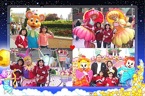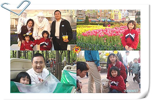 房姐給我們一份中文地圖,告知大概區域後,約定集合時間和地點,就帶我們去坐纜車。到愛寶必玩之處除了驚險刺激的外,就屬動物園了,我們排了近30分鐘才坐到車子,一定要坐靠司機那一邊因為司機會餵食灰熊,可愛的灰熊就拜託他多給些餅乾喔當然也有吃飽飽而不鳥人的傢伙,此時司機就會碎碎唸*%#※。還有獅子、老虎和他們生的小孩獅虎,在車邊晃來晃去呢。配合PEGGY和JENNY去玩了一些小人的遊樂設施,其實那些設施台灣幾乎都有,唯一差別就是服務人員,會唱歌、跳舞,動作很可愛喲(PS:台灣人加油!)。四季花園是愛寶樂園中最美的地方了,春天時開滿了各色的鬱金香。晚餐自理部份,我們吃了中國餐廳的雜醬麵(四季花園旁2F ),還不錯喔晚上遊行也滿精采的,可惜花車和布偶數量不多
