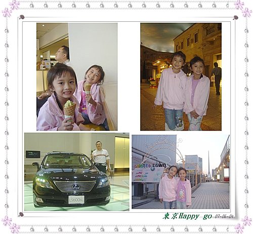 台場--由於昨天先走完淺草觀音寺所以台場停留三小時。台場是時下日本最富人氣的休閒渡假區域,又稱水上城市彩虹城,每個區域均有獨自不同特色,除了不定期舉辦的展示會外,更結合了不同的主題樂園遊樂設施、美食廣場、購物廣場..等。我們直接走到台場小香港,媽咪對名牌衣服及包包沒啥興趣,去小香港純粹尋找”和幸豬排”。只知道”和幸豬排”在5樓就這樣閒晃上去,到了5樓卻怎麼都找不到,只看到許多小朋友玩的遊戲,還有大哥哥、大姐姐為你加油ㄋㄟ,看起來粉高級、粉不錯,可惜聽不懂他們說些什麼,就算去玩似乎也沒樂趣可言。後來只好先去吃抹茶冰淇淋還是只點兩支,畫面永遠都是四個人在搶來搶去的,儀竟然還念拔鼻:胖拔都被你吃光光了啦(真是!不想活囉!!)。