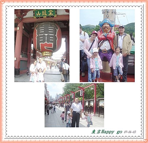 8點20出發後,ㄚ蔣 (我們家的導遊小姐)說:今天早上先走淺草觀音寺(原隔天行程),明天台場就能停留久一點!團員們沒人反對所以就先到了淺草拜拜了。ㄧ進淺草,ㄚ蔣先講解拜拜的方式和一些名產,預定9點30上車。解散後,我們就先淨身,先用水瓢洗左手再洗右手,然後倒一些水在手上飲用或漱口,才能拜拜。拜完後就到對面仲見世通逛逛,每家店都是小小間的卻擠了一堆人買伴手(媽咪當然也是其中ㄧ員啦!)。買完後,老公就直衝有名的雷門(聽說有200多公斤ㄋㄟ),完全不管我和儀在後面用短腿追趕。在雷門照完像後,買現做的人型燒3小個,全落入儀的口中所以不清楚味道如何?買些小飾品後,老公又開始趕、趕、趕,媽咪當然不依,我還沒買到有名的炸饅頭和仙貝ㄋㄟ...所以他就先帶佩和儀去洗手間ㄧ方面等我。當時覺得,出來玩不是應該悠哉悠哉的嗎?怎麼老公趕的比別人快,寧可等人也不讓人等,害我錯失買好物的機會。其實9點多,很多店家尚未開門,賣仙貝的爐具才剛暖爐而已所以只好放棄買現烤的,炸饅頭有分很多口味,但因為早餐吃太飽了只小買2個試吃,好吃、不甜,但因為是炸的,所以小油。