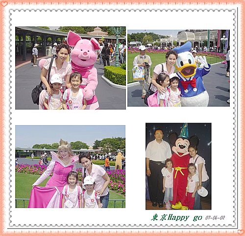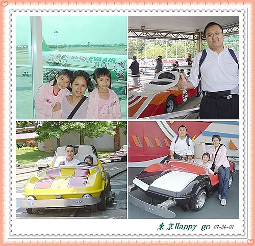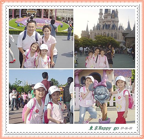 到迪士尼已經9點多(距離有點遠ㄋㄟ)。聽完導遊講解後多數都選擇了舊迪士尼,因為遊戲多,遊行多,樹也多。跟著導遊去抽巴斯光年的FP,竟排到晚上8點45分的。然後去看微縮世界,小老鼠到處亂竄的那一幕真的很逼真,儀和佩都嚇哭了。再去玩賽車,原本以為方向盤只是好看的沒想到可以控制在軌道內約40公分的距離,媽咪開車的技術太爛,無法把車子控制在中央還頻頻撞到軌道咧整個早上只玩了2項!!人滿為患,到處都要排隊啦!